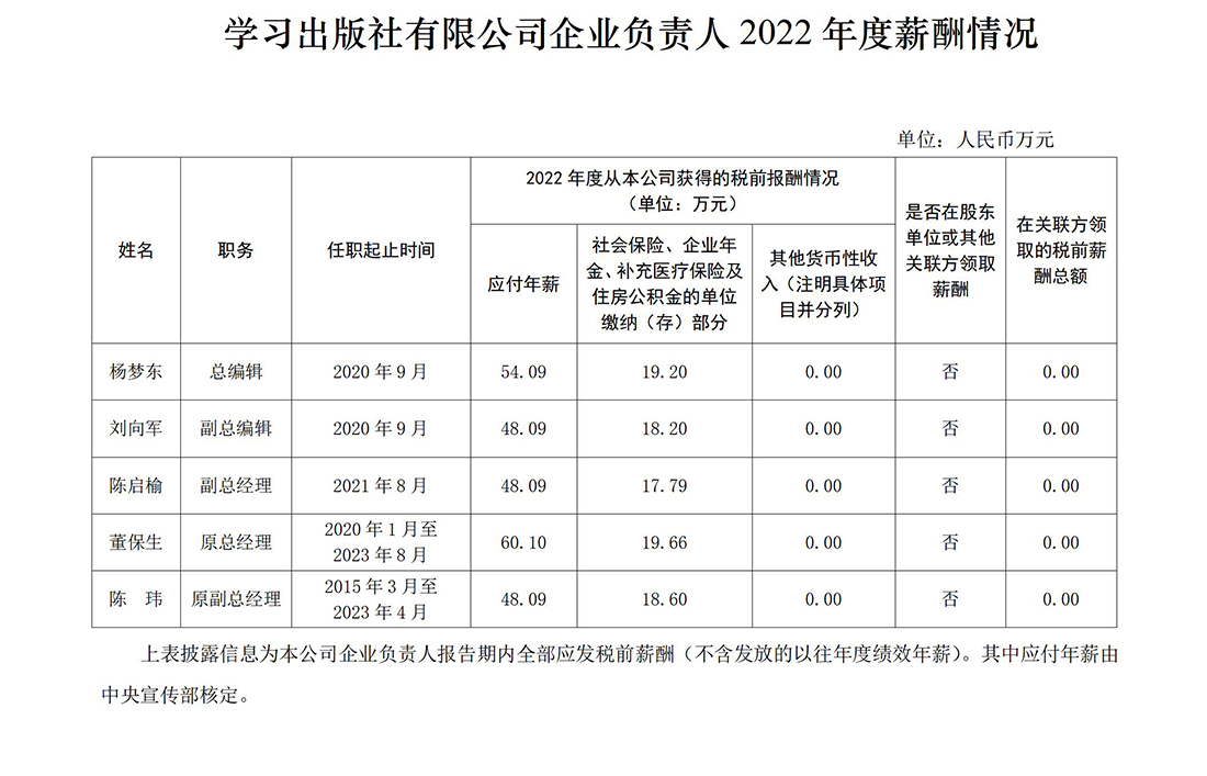 学习出版社有限公司企业负责人2022年度薪酬情况-中国文明网