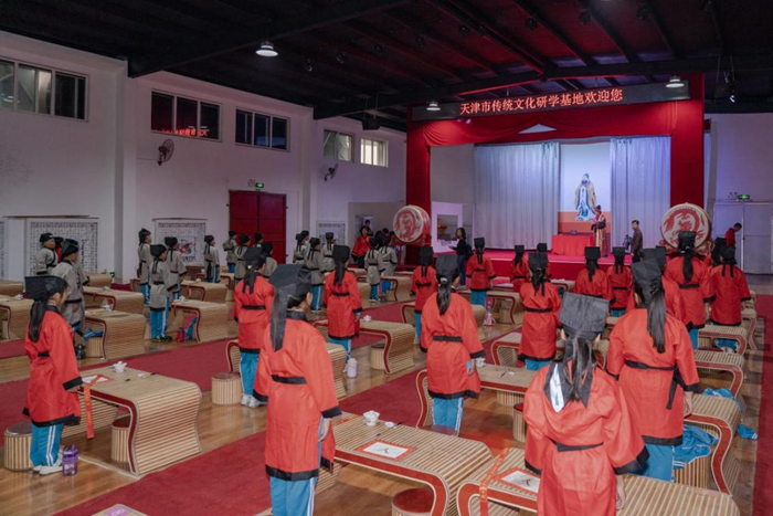 9月26日,在天津市传统文化研学基地,志愿者正在带领小学生们祭拜孔子像、行“开笔礼”。新华网 钟奕 摄
