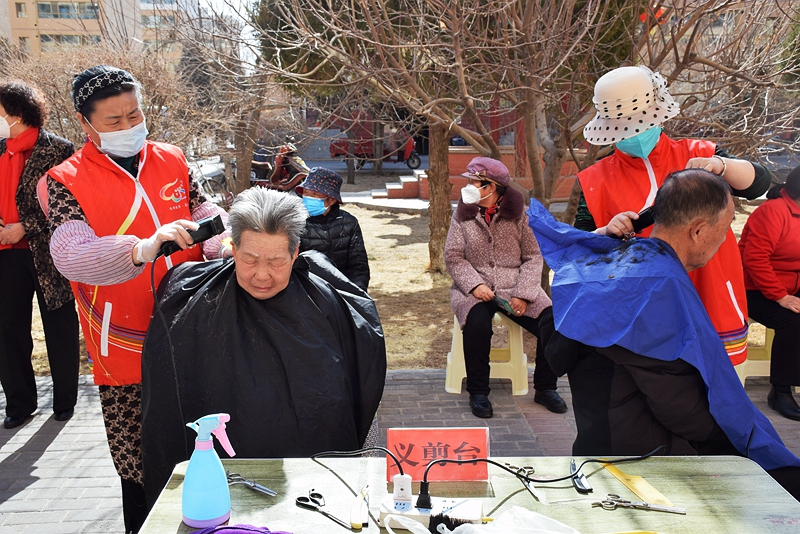 临泽县“新时代文明实践集中服务日”当天,乐民社区组织志愿者走进小区楼院为居民提供“零距离”义剪服务。甘肃张掖市文明办提供
