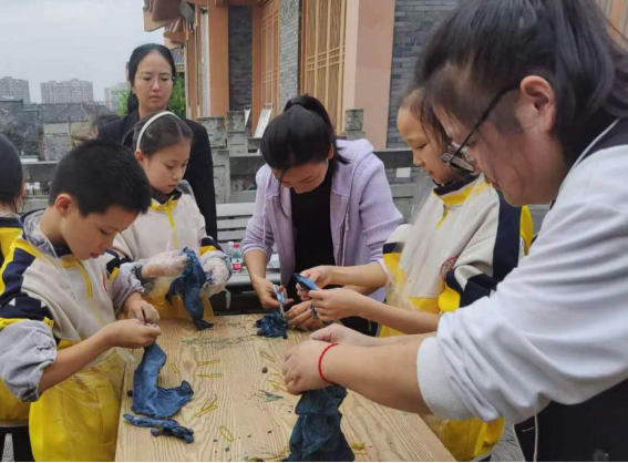 11月2日,在达州市渠县文峰书院,小学生们正在老师的带领下体验传统非遗——“扎染技艺”的魅力。新华网 李然 摄