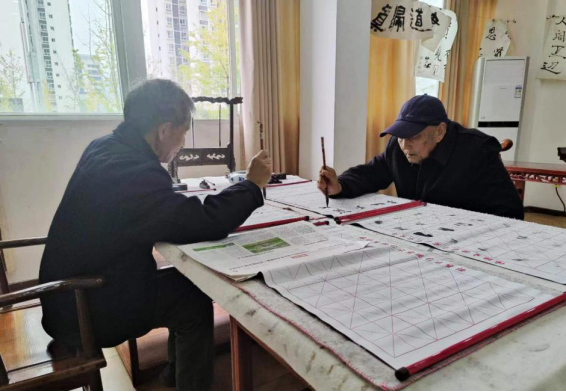 82岁的居民刘明层和82岁的唐代志正在杨柳社区新时代文明实践站共享书画室内专心致志地写着毛笔字(11月3日摄)。新华网 李然 摄