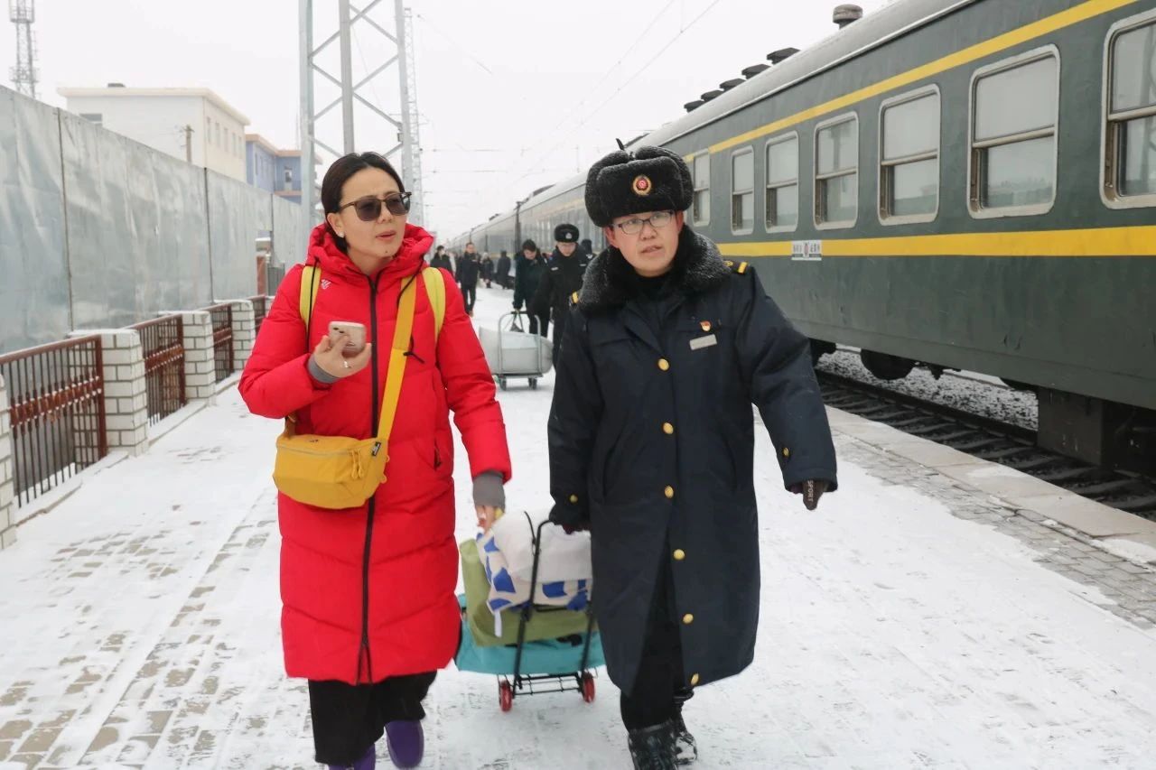 内蒙古集宁车务段职工帮助旅客提拿行李。